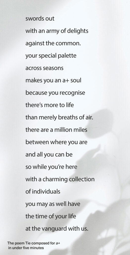 Following the interview, we put the poet to the test. The poem below was created for a+ and incorporates our tagline, “at the vanguard ”.