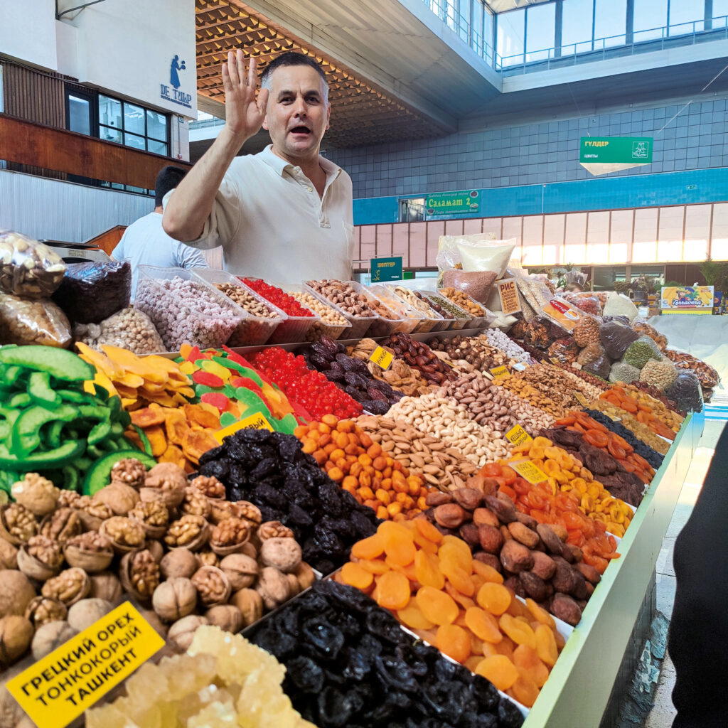 This cacophonous market, with the aromas of grilled meat and spices, is a kaleidoscope of colours and flavours. Featuring shelves of fruits, vegetables, meats, cheeses, nuts, and spices, it is a local favourite. Here, talkative shopkeepers from across central Asia sell their wares. Matronly women with headscarves peddle salted cheese and the local delicacy of horse meat as Tajik merchants sell enticing mounds of dried fruits and nuts.