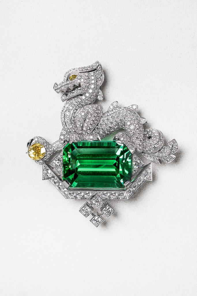Cartier’s fantastical bestiary includes this formidable magical creature in rare creations, such as the Bailong clip, another highlight from the new Le Voyage Recommencé collection. Translated from Chinese to “white dragon”, it boasts a diamond-encrusted dragon with striking yellow diamond eyes, elegantly perched atop a 30.11-ct octagonal tourmaline. One of its claws delicately cradles a yellow diamond, adding to the allure of this rare masterpiece. The design achieves a harmonious balance, seamlessly marrying the upper section defined by rounded, curved lines with the geometric diamond motifs below.
