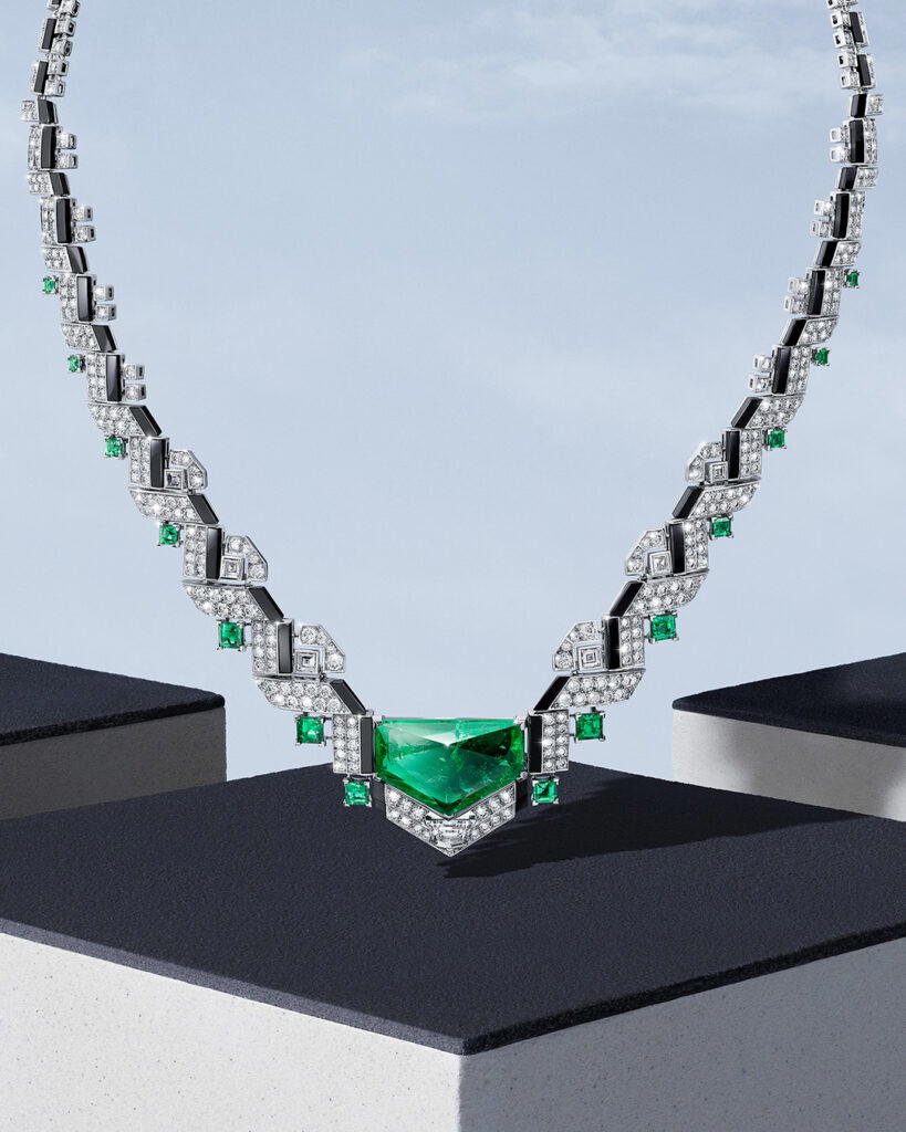 Other pieces that stand out in the collection include the Nauha necklace and the Attrare ring. The elegant necklace features the classic colour combination of green and black, and showcases an emerald that weighs 14.17 cts in a pentagonal cut. Combining a shield-cut diamond, square emeralds, smaller diamonds, and graphic lines of onyx, the necklace creates a rhythmic visual effect that amplifies its stunning allure.