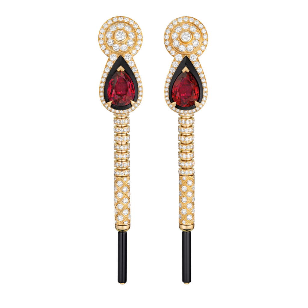 This innovation continues in the Gold Slider earrings, where grommet-shaped onyx components attached to diamond-set tube chains dangle suggestively from the earlobes. The chains are detachable, leaving behind pear-shaped rubies weighing approximately 4.30 cts and offering a sporty elegance that is versatile and refined.