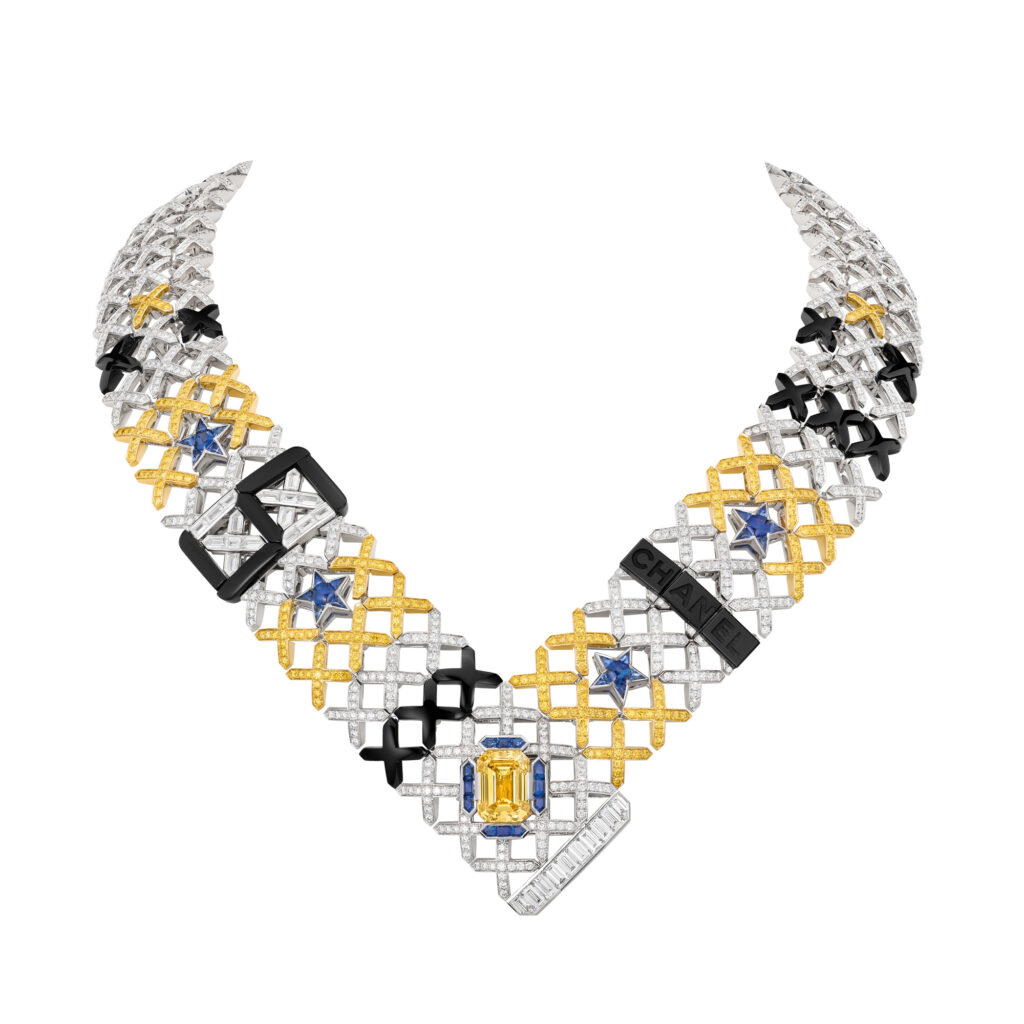 The largest, a 17.18-ct sapphire, stars in a transformable ring set with diamonds, while the second-largest, a 10.15-ct stone, takes centre stage on the Graphic Line necklace. It is composed of rubies, onyx, and mixed-cut diamonds in a bold chevron design echoing Gabrielle Chanel’s Comète necklace from 1932.
