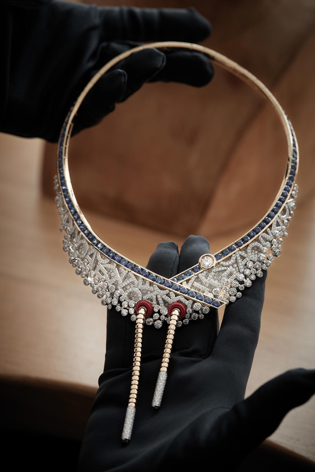 The utilitarian sports cord is reimagined as two tubular gold chains that drape elegantly down the neck, complete with diamond-set aglets and lacquered gold grommets. Each link is painstakingly crafted by master jewellers, with the necklace further adorned with sapphires, diamonds, and vibrant red lacquer.