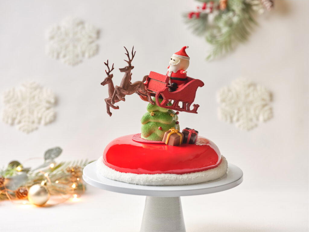 Get the conversation started with this super-cute entremet cake – yes, that chocolate sleigh is hand-sculpted. Its glossy red exterior reveals silky layers of strawberry yoghurt mousse and yuzu crémeux.
