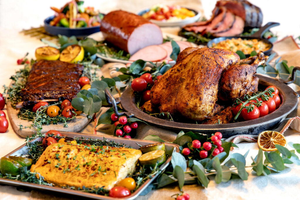 Perfect for a big party of eight to ten persons, the Holiday Splendour bundle from The Marmalade Pantry features wholesome roasts, hearty sides, and decadent desserts. Start with a delectable Cheese & Charcuterie Platter, before tucking into hearty dishes like Chilli-Lime Coriander Glazed Slow Baked Salmon, BBQ Gochujang Pork Ribs, Yuzu Marmalade Glazed Honey Baked Ham, Sous Vide Beef Ribeye, and Mesquite Marinated Roasted Whole Turkey. Pair these savouries with sides such as Roasted Harvests, Tabbouleh Salad, Butternut Mac & Cheese, and Fried Smashed Potatoes. For a sweet finishing touch, dig into the Pumpkin Spice Gateau or the Chocolate Coco Yule Log Cake.