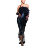 Effortless dresses highlight the feminine figure and draw inspiration from porcelain bottlenecks. A signature Feng Ya Qi silhouette featuring a cinched waist and rounded hem, is both sensual and sculptural. Chan’s transformable pieces are also designed to maximise versatility. A bustier frock includes a removable embellished band around the bust, allowing wearers to dress it up or down. Similarly, a minidress with a feather-adorned bustier can be unzipped to become a simple shift.