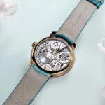 Elevating the intricate design, the minute track, crafted from lustrous mother-of-pearl, shimmers with laser-engraved butterflies that seem to dance across its surface. This delicate touch adds yet another layer of artistry, perfectly enhancing the watch’s dreamlike, ethereal allure. The timepieces are housed in rose gold cases adorned with sparkling diamonds, adding to their luxurious appeal.
