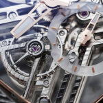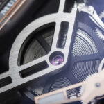The Jubilee Edition’s case, skeletonised movement, crown, and buckle are all crafted from Damascus steel, cut from single blocks using CNC machines. The alloy, made from stainless steels 316L and 304L through advanced powder metallurgy, ensures that each watch is unique, showcasing distinct striations and requiring careful polishing to preserve its iconic pattern.