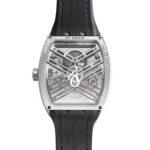 Powered by the skeletonised calibre MVT FM 1740-VS2, the watch boasts intricate Damascus steel bridges, framed by a rose gold flange. With a twin-barrel configuration offering a 7-day power reserve, this movement exemplifies Franck Muller’s technical prowess, adorned with sophisticated finishing techniques that heighten its complexity and beauty. Completing the look is a black alligator leather strap with rose gold stitching, a detail that underscores the meticulous attention to quality for which the brand is known.