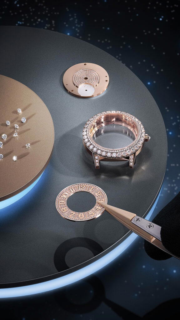 With hundreds of stones and gold beads holding them in place, this symmetrical pattern demonstrates the skill and precision of the jewellers at Jaeger-LeCoultre’s Métiers Rares workshop. It was established in 2016 to showcase the maison’s in-house watchmaking crafts: enamelling, engraving, gem setting, and guilloché.