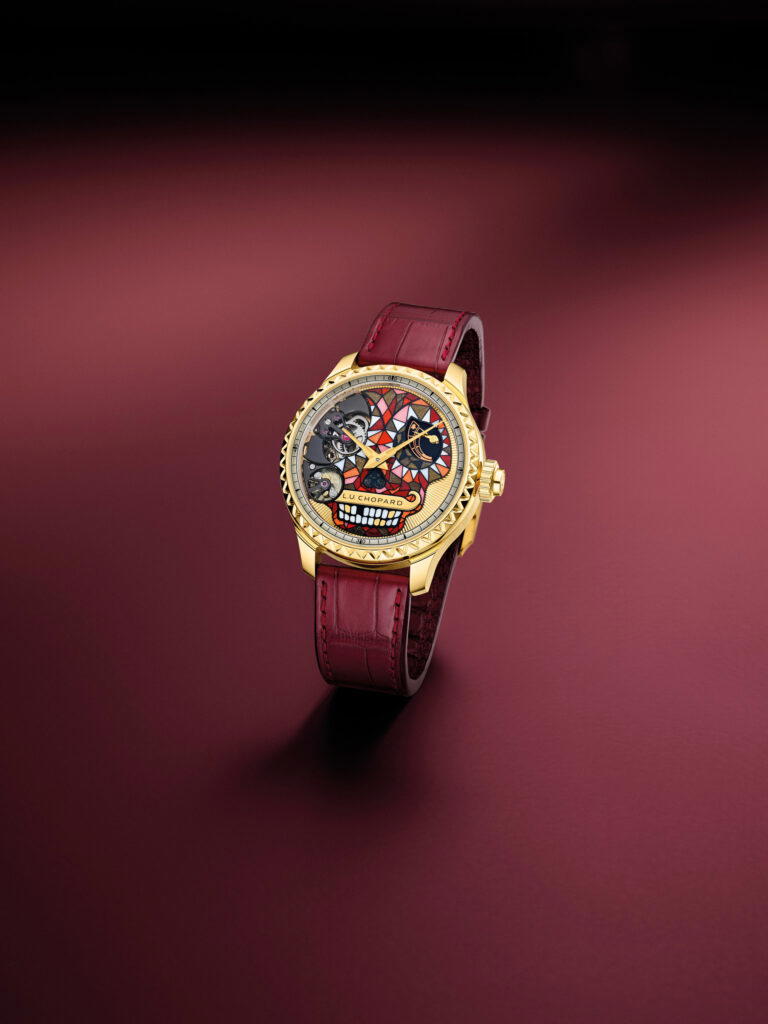 The dial features a mosaic of stone marquetry, with milk opal, pink opal, orange and red carnelian, orange and red aventurine, golden obsidian, and black jade. Chopard’s artisans took over 100 hours to select, prepare, and assemble these materials, each measuring just a few square millimetres and 0.4mm thick. The joyfully colourful calavera motif is framed by a guilloche gold surface, while the blackened hammers and power-reserve indicators cleverly form the watch’s eye sockets.