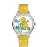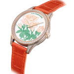 The house introduces three new eight-piece editions in ethical white or rose gold, each adorned with Grand Feu enamel dials. Drawing inspiration from antique decorative pocket watches housed in the L.U.CEUM, Chopard’s museum in Fleurier, the dials evoke the precision and charm of botanical watercolour illustrations. The yellow roses represent friendship and joy; pink, a nod to grace and elegance; and orange, a symbol of passion.