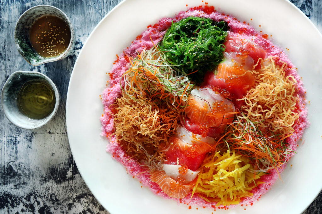 Celebrate Lunar New Year with a modern Japanese twist at Ginkyō by Kinki. Usher in good fortune with the Abundance Yu Sheng, featuring salmon, tuna, and swordfish sashimi, arranged on a bed of shredded daikon. For an extra burst of umami, glistening orbs of ikura and tobiko sit atop the sashimi, while truffle oil and goma dressing are drizzled over. Complete the meal with Ginkyō’s Golden Age maki and the Mikan Carpaccio. Finally, toast to a good year with Born A’ Star, a vodka-based cocktail with passionfruit puree and fresh lime juice.