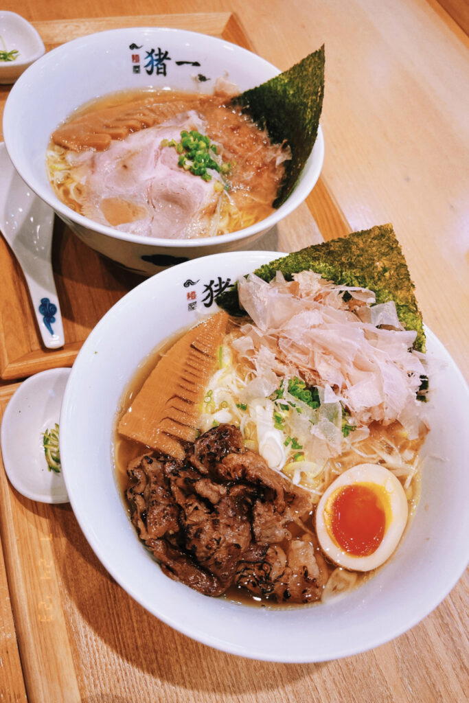 In keeping with its Kyoto roots, dashi is the lifeblood of this popular ramen restaurant. The deeply aromatic broth is made from rausu kombu, an umami-rich kelp, and several types of dried seafood. While the white ramen is delicious, I recommend the black ramen for its full-bodied flavour. It pairs beautifully with torched wagyu beef. The final touch is a generous topping of dried bonito flakes, freshly shaved to a 0.01-mm thickness so that it melts quickly into the broth.