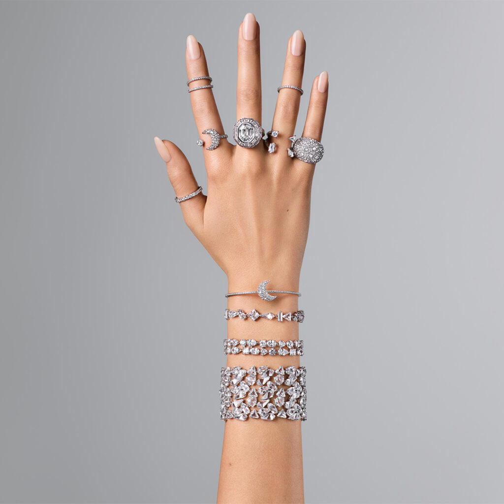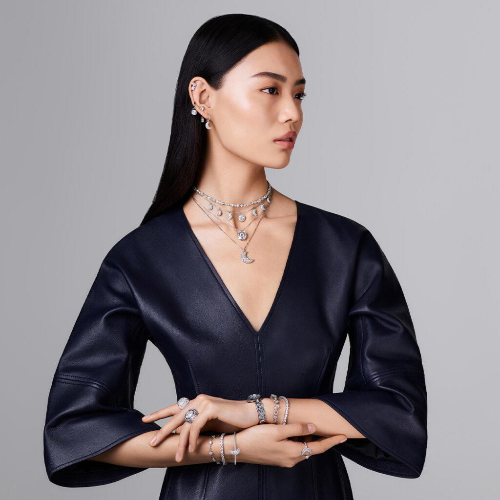 Add a glimmer to your outfits with Swarovski’s selection of adornments and gifts. This season’s jewellery highlights mixed cuts and multi-faceted stones, each crafted for maximum shine. Collections include Luna, which transforms the crescent shape into an array of edgy jewellery pieces; and Mesmera, which highlights pieces made with bold and translucent crystals. Evoking a winter wonderland, Gema is a constellation of crystals, clustered together in radiant shades of blue and white. For extra drama, turn to Hyperbola, with its twisting sleek metals and spirals of green and white stones.