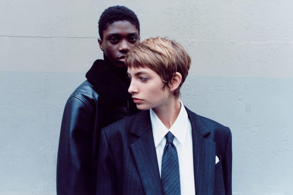 Perfect for Christmas, its fall-winter collection asserts a sense of contrast with playful opposites. The brand reimagines the meeting of minds: a woman who prefers a preppy demeanour versus one who leans towards a sensual, feminine aesthetic. This divergence is explored through rhinestone-covered pieces or lingerie details that liven up banded sweaters and pleated skirts borrowed from college years. The collection highlights contradictions through shine combined with matte, and opaque sublimated by transparency. A great example: a soft satin dress paired with an oversized leather jacket.