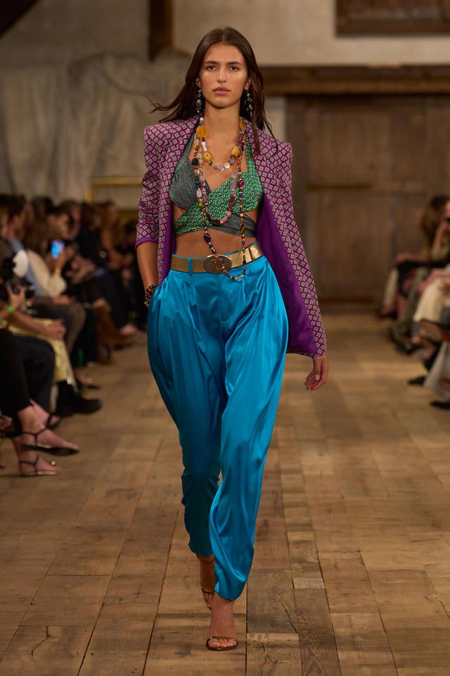 Ralph also played with vibrant colours, splashing purples, golds, greens, blues, and more onto blouses, cardigans, pants, and skirts. It was a kaleidoscopic visual feast. In the hands of a less experienced designer, the result might have been a horrible hodge-podge of hubris. Not in Ralph’s capable digits.