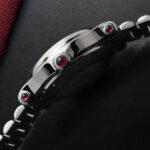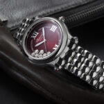 For the first time, a burgundy-red dial appears on a Happy Sport watch, symbolising Sincere’s passionate commitment to fostering and growing an appreciation of horology. From the side profile, five cabochon-cut red sapphires—an unusual touch—are set on the lugs and crown, perfectly complementing the dial.