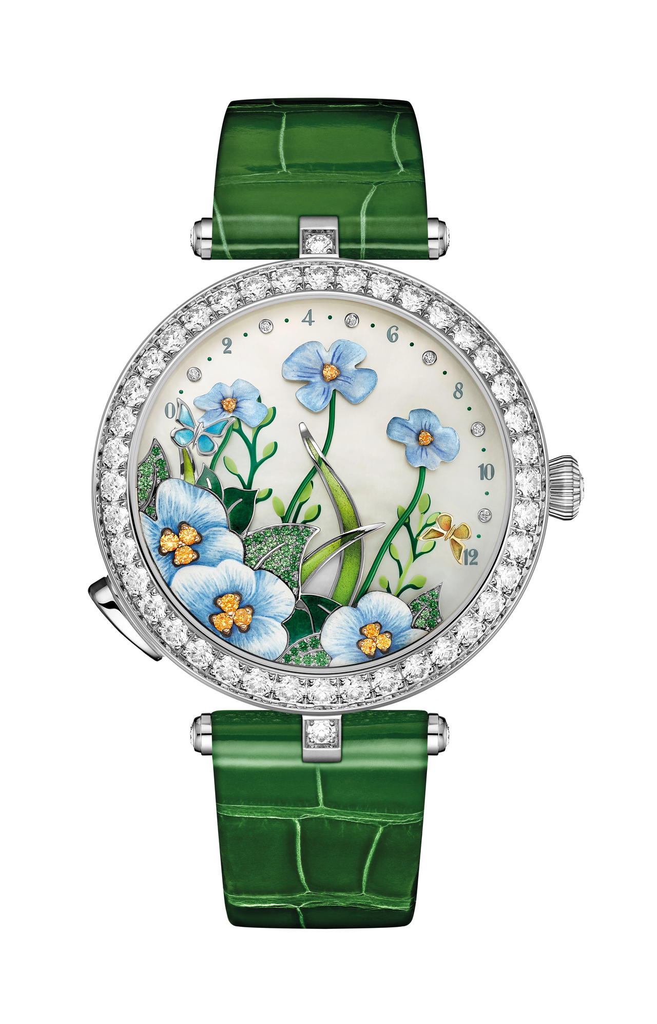 The Lady Arpels Brise d’Été has a forest green alligator strap with a white gold buckle, but the single lug case features a quick-change mechanism for effortless strap swaps. Van Cleef & Arpels manages both its métiers d’art and watchmaking entirely in-house, with artistic work based in Paris and watchmaking in Geneva. It has made it a priority to preserve enamelling within its walls as it becomes increasingly rare. With the establishment of its métiers d’art workshops, the brand has enhanced the uniqueness of its creations.