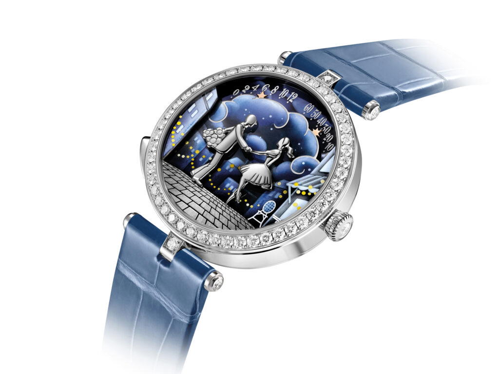 The Lady Arpels Bals des Amoureux Automate reimagines the lovers’ rendezvous in a new setting: beneath the lantern-lit charm of a guinguette, one of many open-air dance cafes that once lined the outskirts of 19th-century Paris. At noon and midnight, an automaton movement brings the pair together for a kiss, a signature moment of the collection. The wearer can relive this moment on demand with the swift push of a button.