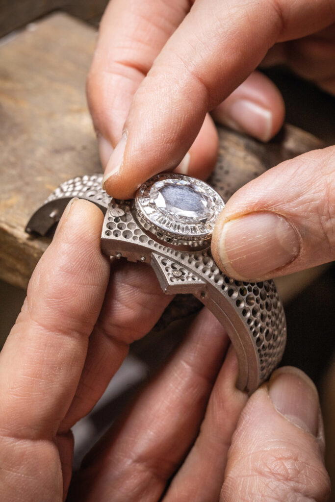 Every other detail is also crafted with care. For example, an iron eye base with gold streaks echos the celestial theme, while a petrified palmwood bowl by the house cradles a feathered basket, its texture revealed by expert cuts and polishes. This piece is also notable for its rotation ring, which indicates the time with diamond-tipped feathers held by a bow entirely paved in diamonds.